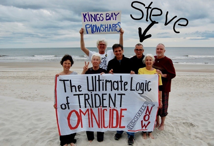 Zo knipte Steve op de vijftigste sterfdag van M.L.King, 4 april 2018, met zes Catholic Workers een gat in een veiligheidshek en betrad de thuisbasis van de Atlantische Tridentvloot. Ze hingen een spandoek op met de tekst ‘De ultieme logica van Trident: Omnicide’, bevestigden een poster van Martin Luther King Jr. aan een model van een Trident II D5-raket, versierden het gebied met crime-scene tape, spoten ‘Love One Another’ op de stoep, sloegen met een hamer op een display van een raket, en goten hun eigen bloed op een officieel zegel van de basis. Een van hen liet een aanklacht tegen de Verenigde Staten achter, een ander een exemplaar van Daniel Ellsbergs boek The Doomsday Machine, en een derde las de verklaring van paus Franciscus voor waarin hij kernwapens afkeurt.