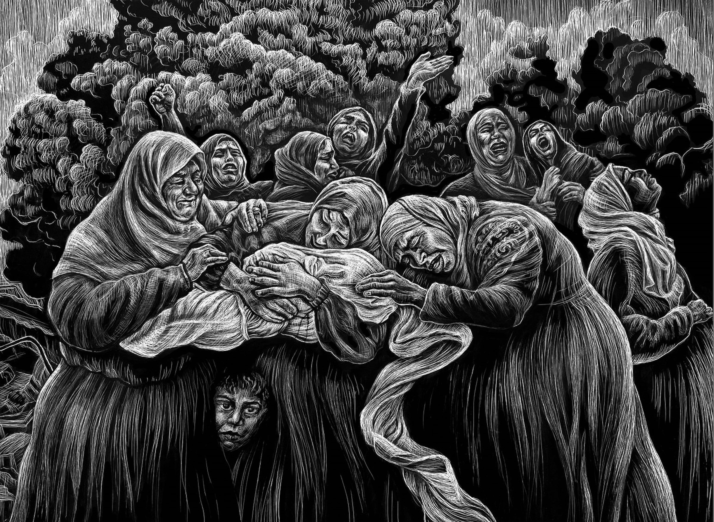 Na de viering stapten we de kou in. De processie naar de Dam was een stille rouwmars. Alleen het geluid van een trom die elke zevende stap sloeg, weerklonk. Elke stap droeg een gewicht van verdriet, en herinnerde ons eraan dat zwijgen een vorm van medeplichtigheid is aan onrecht. De organisatoren ontvouwden een groot wit spandoek, bedekt met honderden namen: Ahmed, Lina, Yusuf, Amina…, allemaal bedoeld om gehoord te worden.