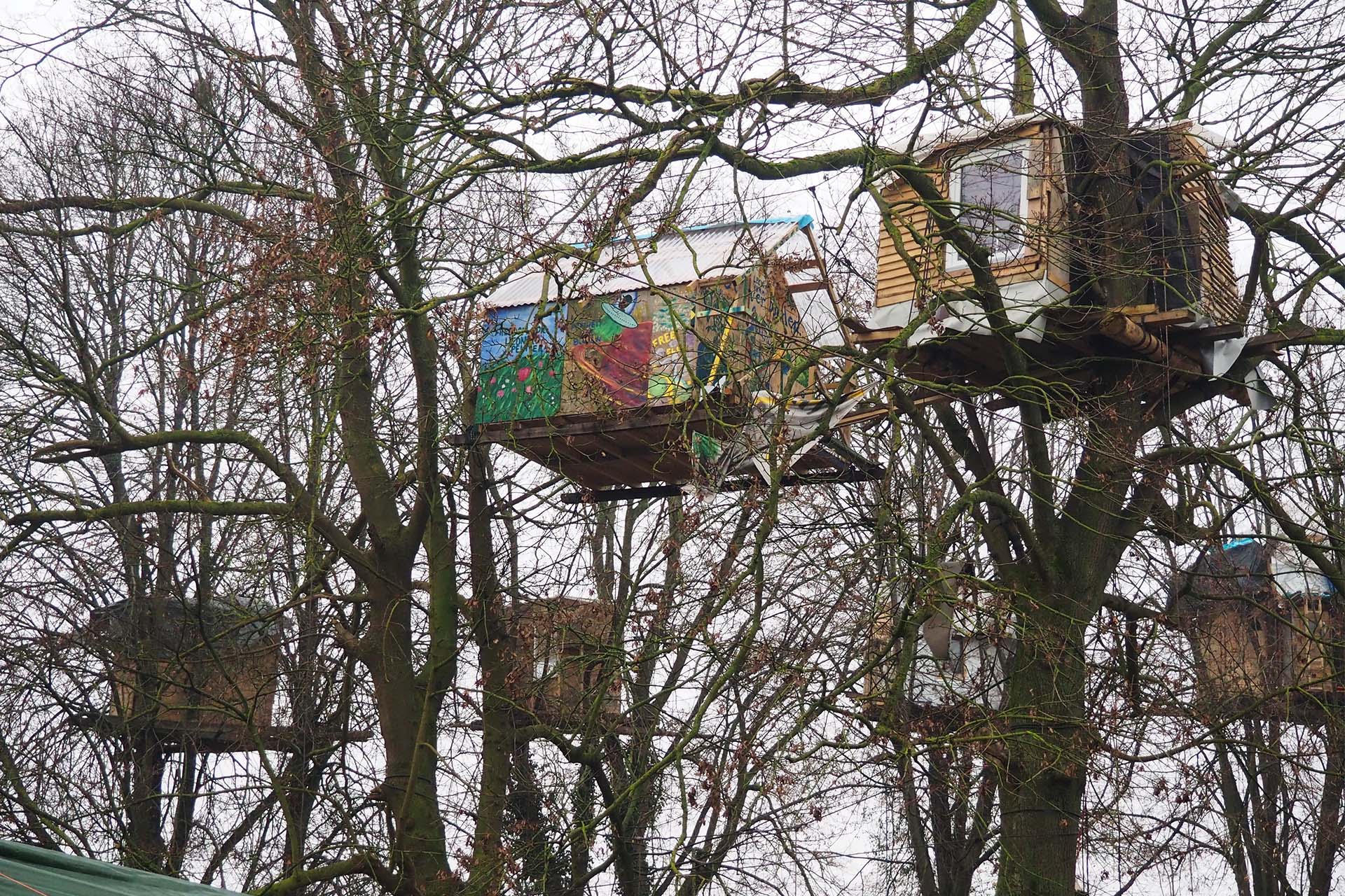 Bomen en mensen in bomen, voor een samenleving zonder bruinkoolwinning met een veel lager energie– en grondstoffenverbruik en ruimte voor alle levenswijzen.
