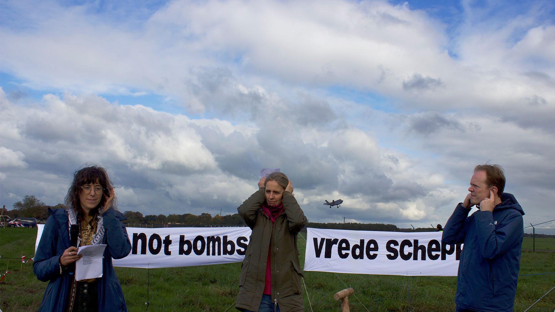 Met de actie ‘Vrede oefenen’ hebben wij van het Noëlhuis op 16 oktober een kleurrijke actie met burgerlijke ongehoorzaamheid in Volkel georganiseerd. Tijdens een picknick met 15 mensen hebben we ongeveer 50 bomen geplant net buiten de vliegbasis aan de kop van de startbaan. De bomen helpen ons om iets te doen tegen de waanzinnige CO2-uitstoot van de straaljagers. En “als de bomen groeien, wordt het voor de gevechtsvliegtuigen steeds moeilijker om hier te starten en te landen”, aldus Frieda, die twee weken geleden nog tot een boete was veroordeeld omdat ze drie jaar geleden op de taxibaan van de luchtbasis een vredesgebed hield. “Hier wordt geoefend hoe je de hele wereld zo efficiënt en effectief mogelijk kunt vernietigen. Het duurt lang voordat bomen groeien, en ook voor vrede hebben we geduld nodig”, zegt Nikki van het Noëlhuis. Na een picknick met koffie en thee zijn vijf vredesactivisten met roze schoppen begonnen een tunnel onder het hek naar de vliegbasis te graven om de start- en landingsbaan te blokkeren en het gebulder STIL te leggen. Meteen na de eerste spadesteek werden alle vijf gearresteerd en overgebracht naar het politiebureau van de nabijgelegen stad Uden, waar ze werden gefotografeerd en gefilmd. Of dit tot een aanklacht zal leiden, is onduidelijk.